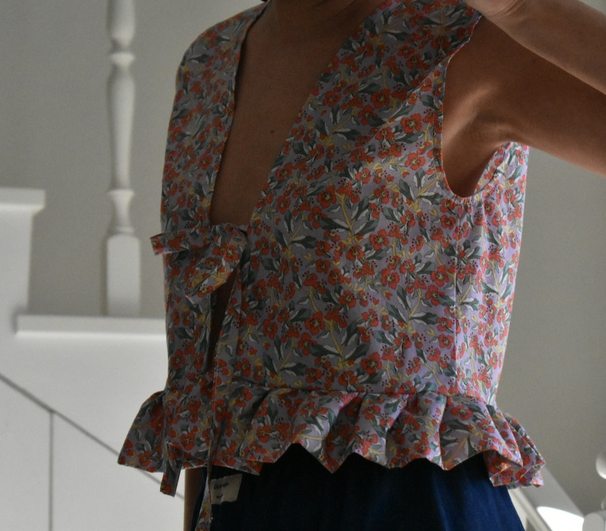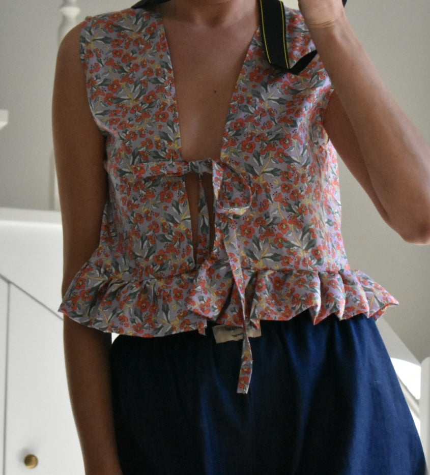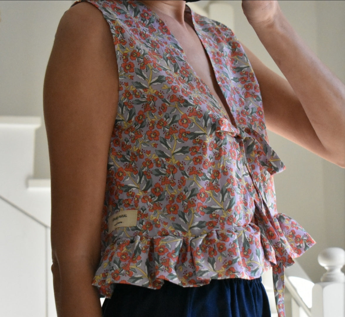 Chaleco floral hecho a mano. Se puede usar con la abertura en la parte delantera o trasera.