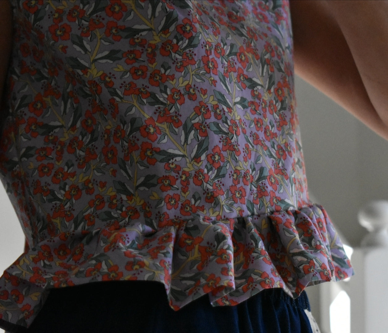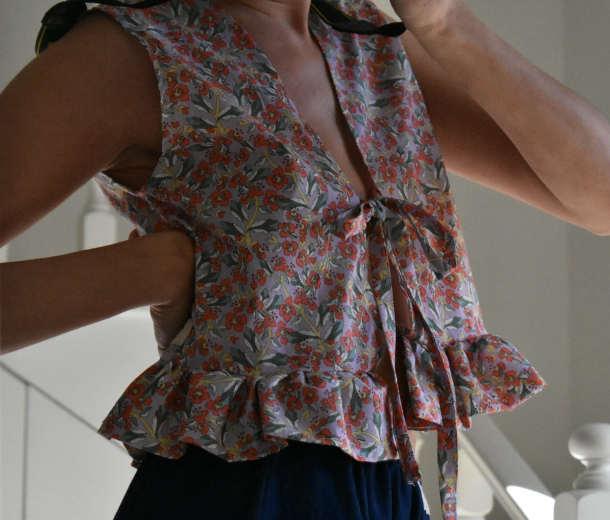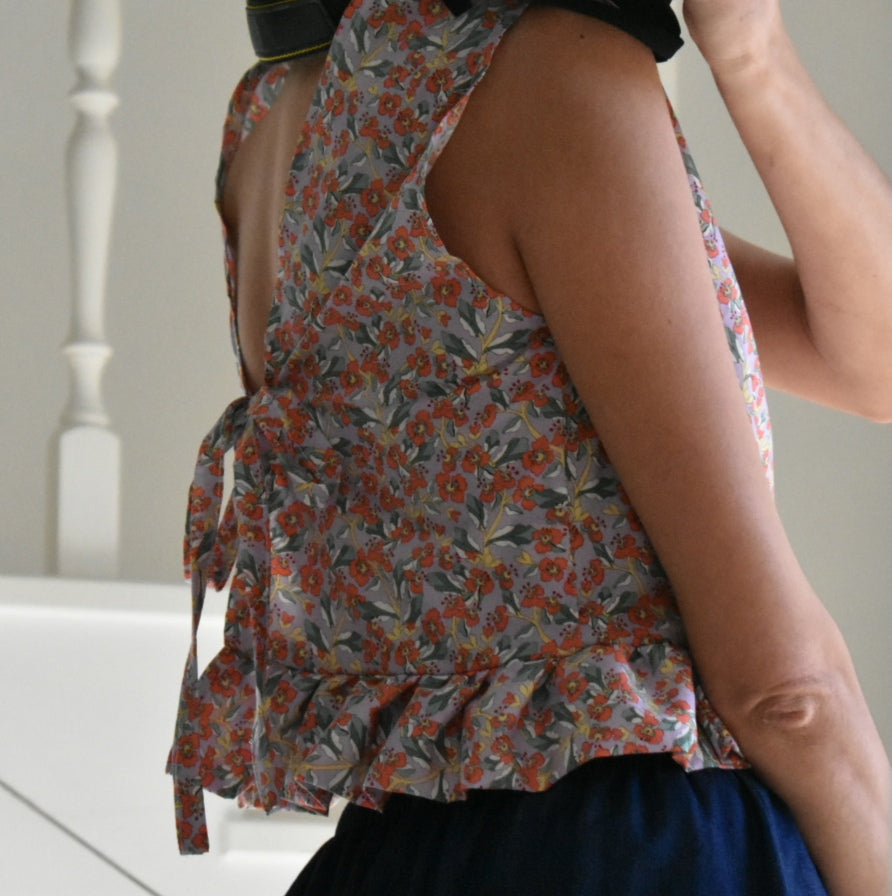 Chaleco floral hecho a mano. Se puede usar con la abertura en la parte delantera o trasera.
