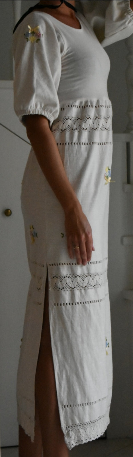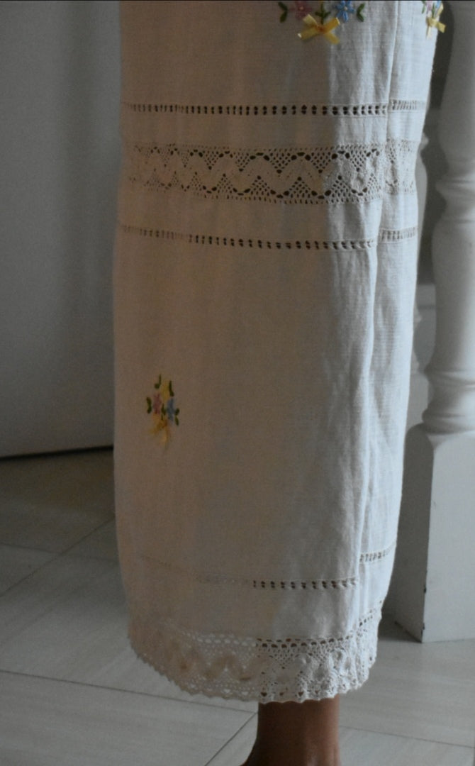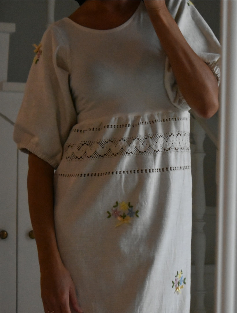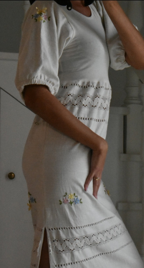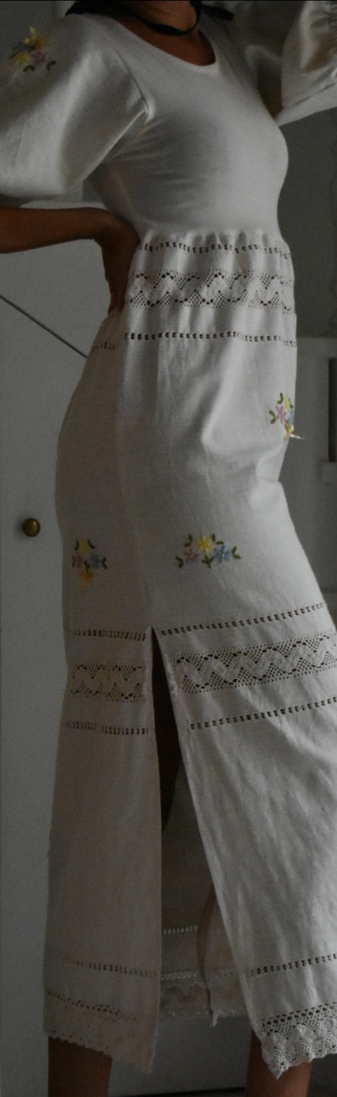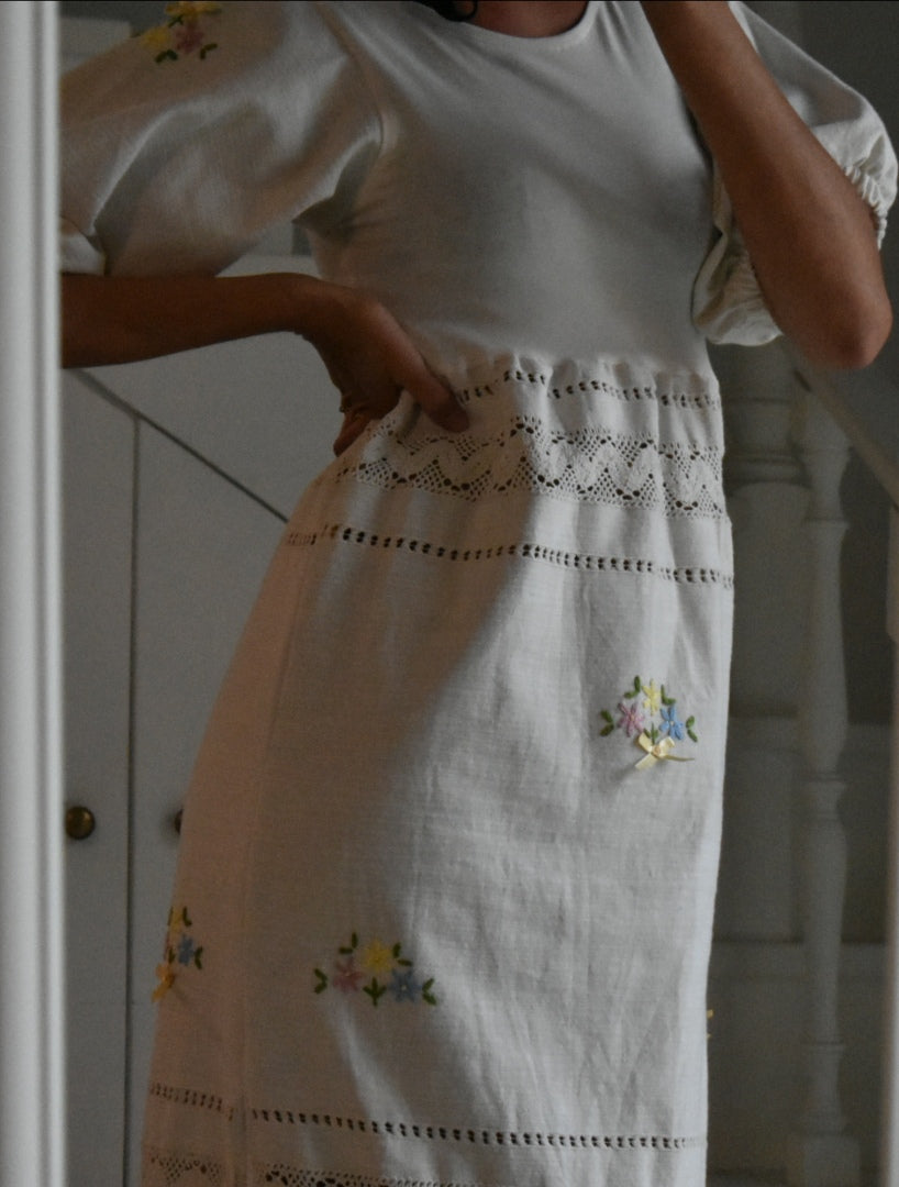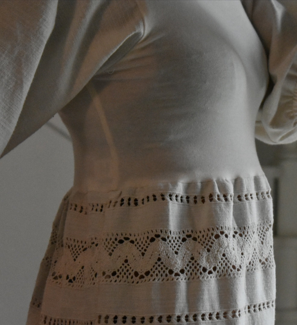 Materiale: tessuti acquistati nei mercati locali. La parte superiore (escluse le maniche) è realizzata in 95% cotone e 5% elastan. Il tessuto principale del vestito proviene da un materiale vintage senza etichetta di composizione, ma al tatto e alla lavorazione risulta simile a un cotone naturale. Arrichito da dettagli in pizzo e ricami floreali.