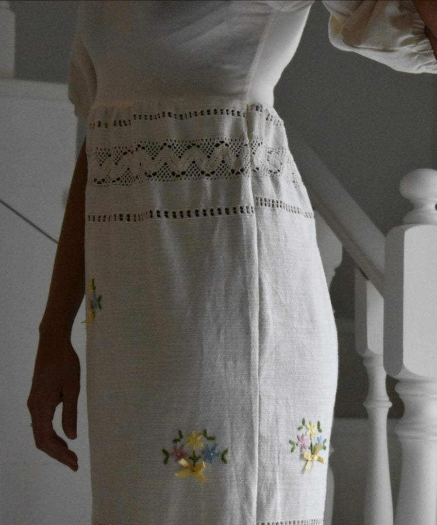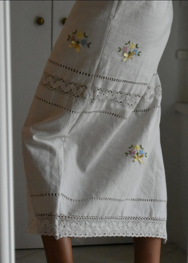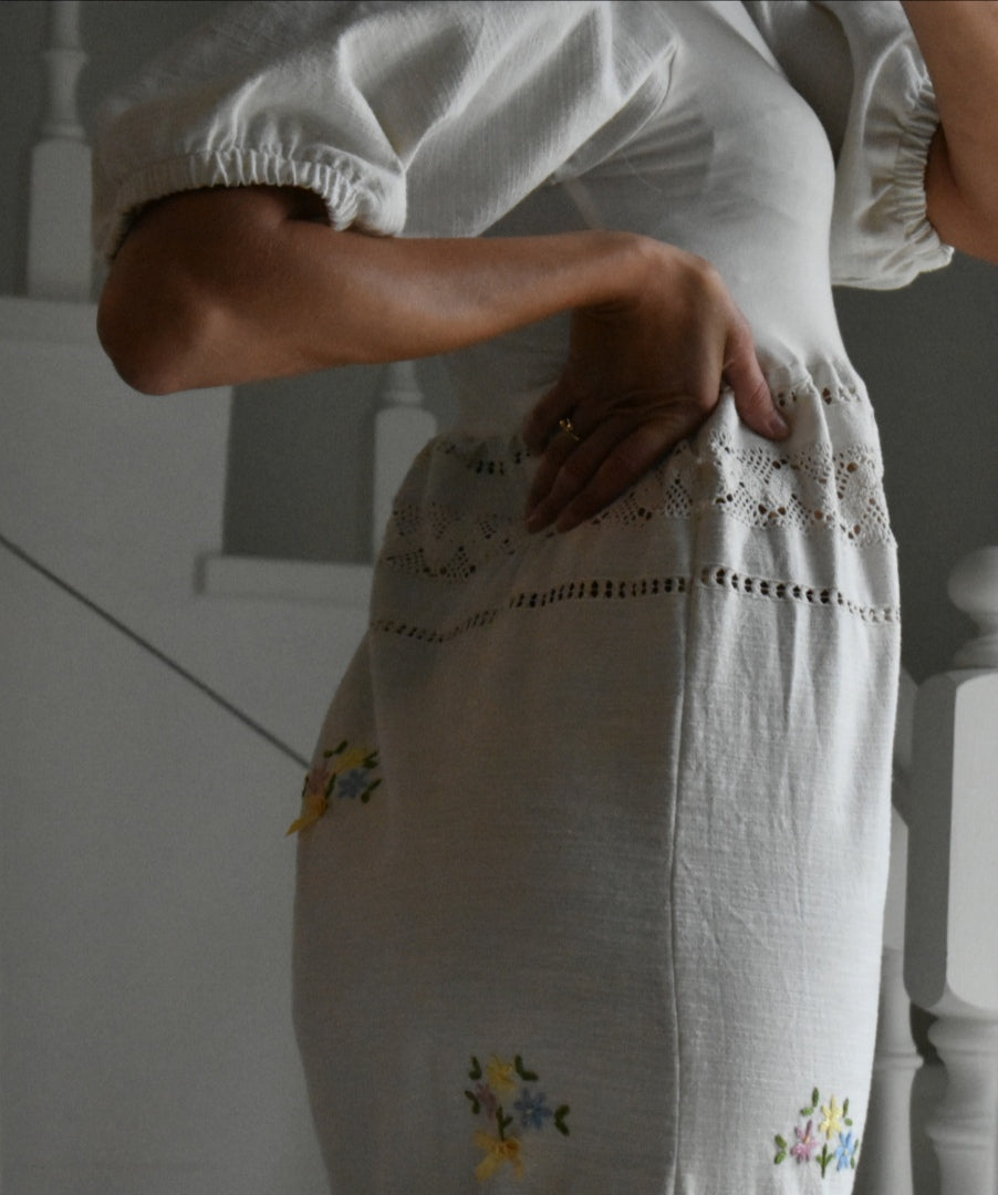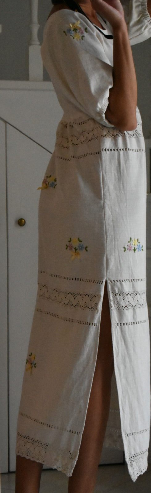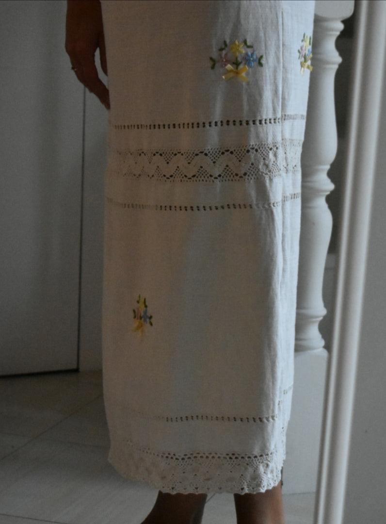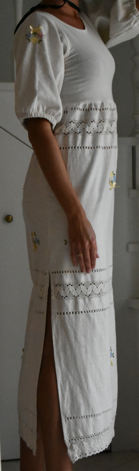 Materiale: tessuti acquistati nei mercati locali. La parte superiore (escluse le maniche) è realizzata in 95% cotone e 5% elastan. Il tessuto principale del vestito proviene da un materiale vintage senza etichetta di composizione, ma al tatto e alla lavorazione risulta simile a un cotone naturale. Arrichito da dettagli in pizzo e ricami floreali.