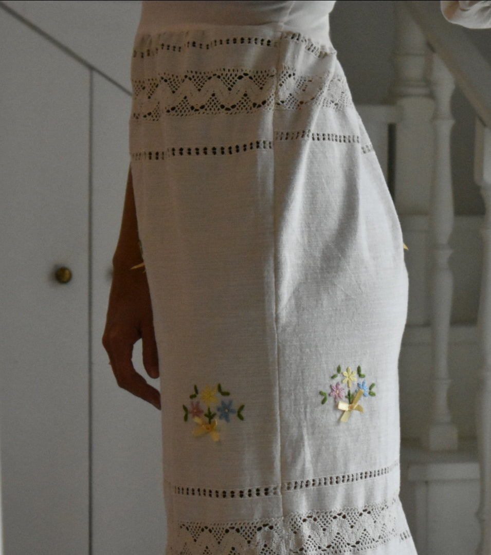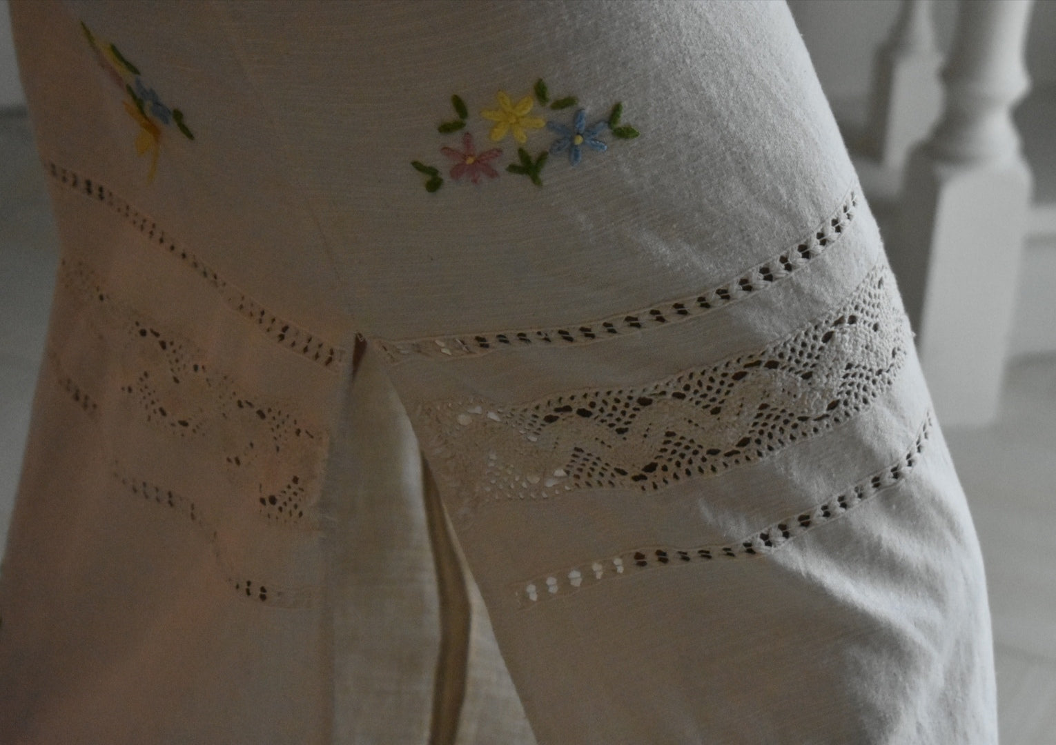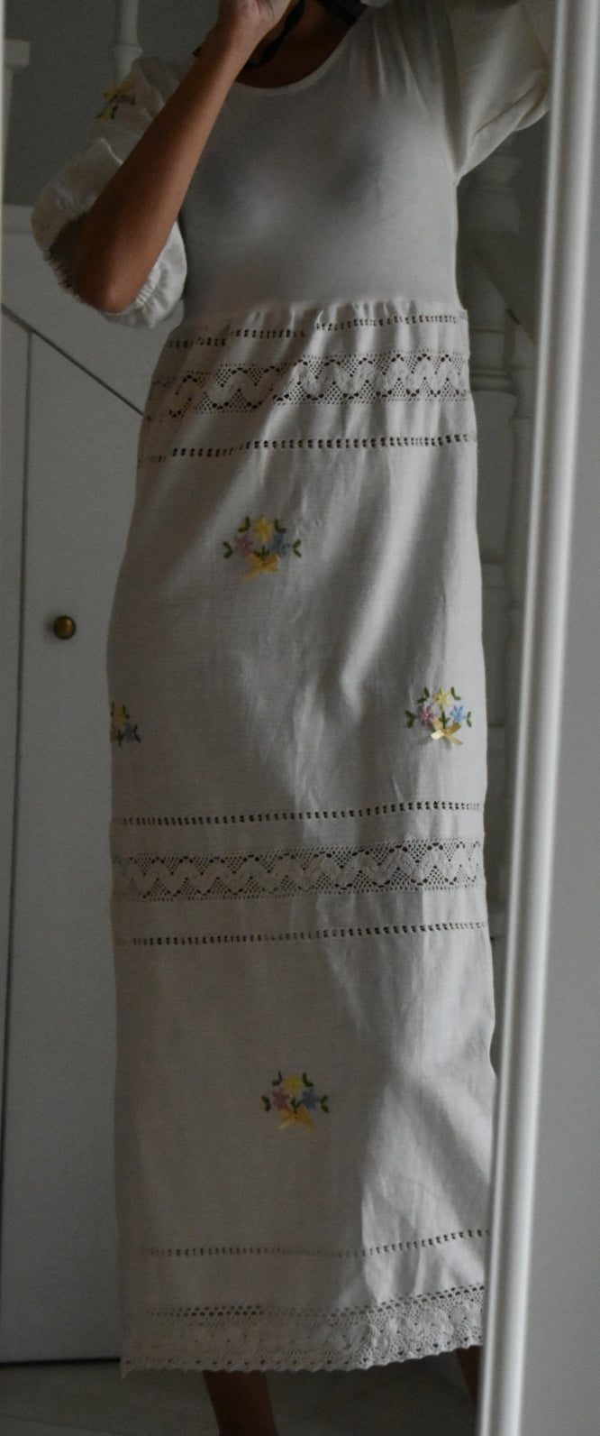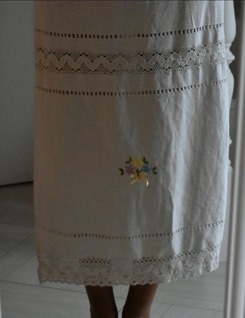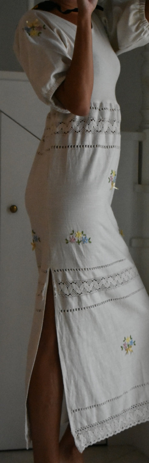 Materiale: tessuti acquistati nei mercati locali. La parte superiore (escluse le maniche) è realizzata in 95% cotone e 5% elastan. Il tessuto principale del vestito proviene da un materiale vintage senza etichetta di composizione, ma al tatto e alla lavorazione risulta simile a un cotone naturale. Arrichito da dettagli in pizzo e ricami floreali.
