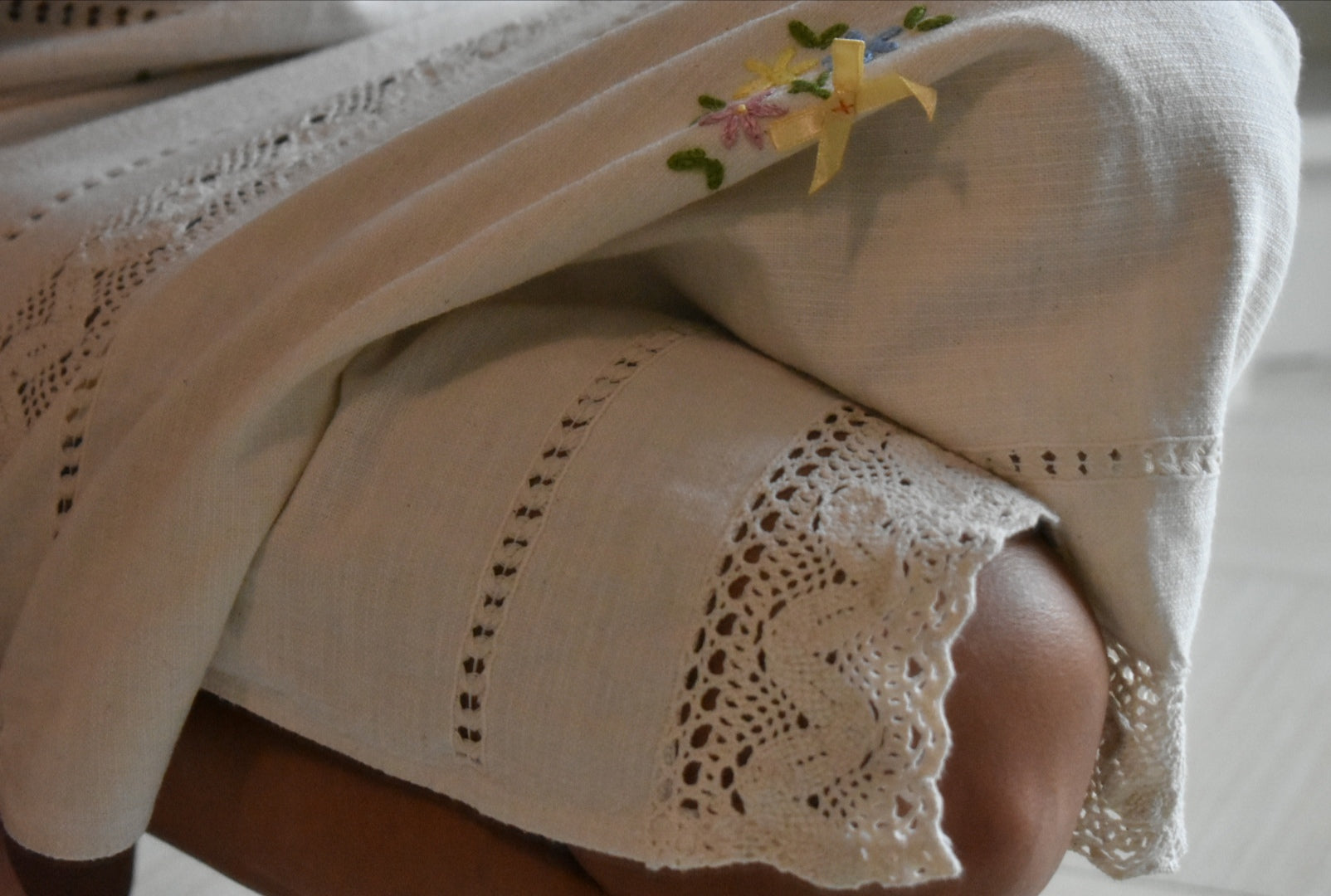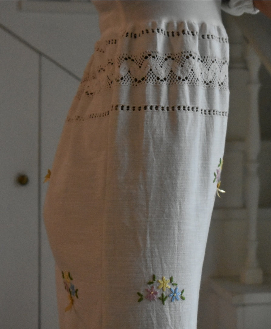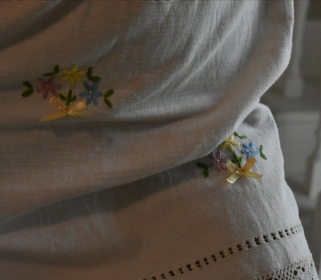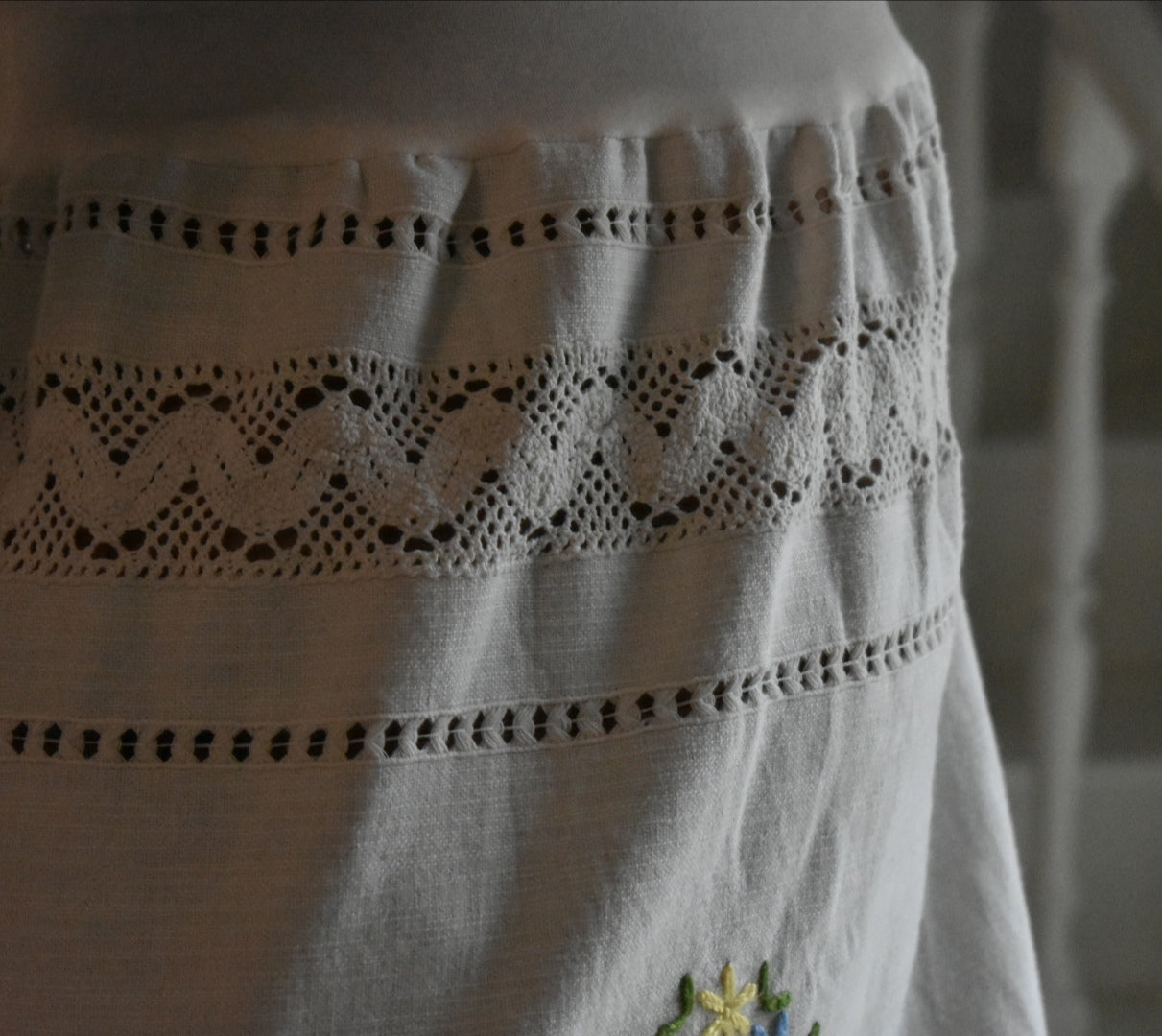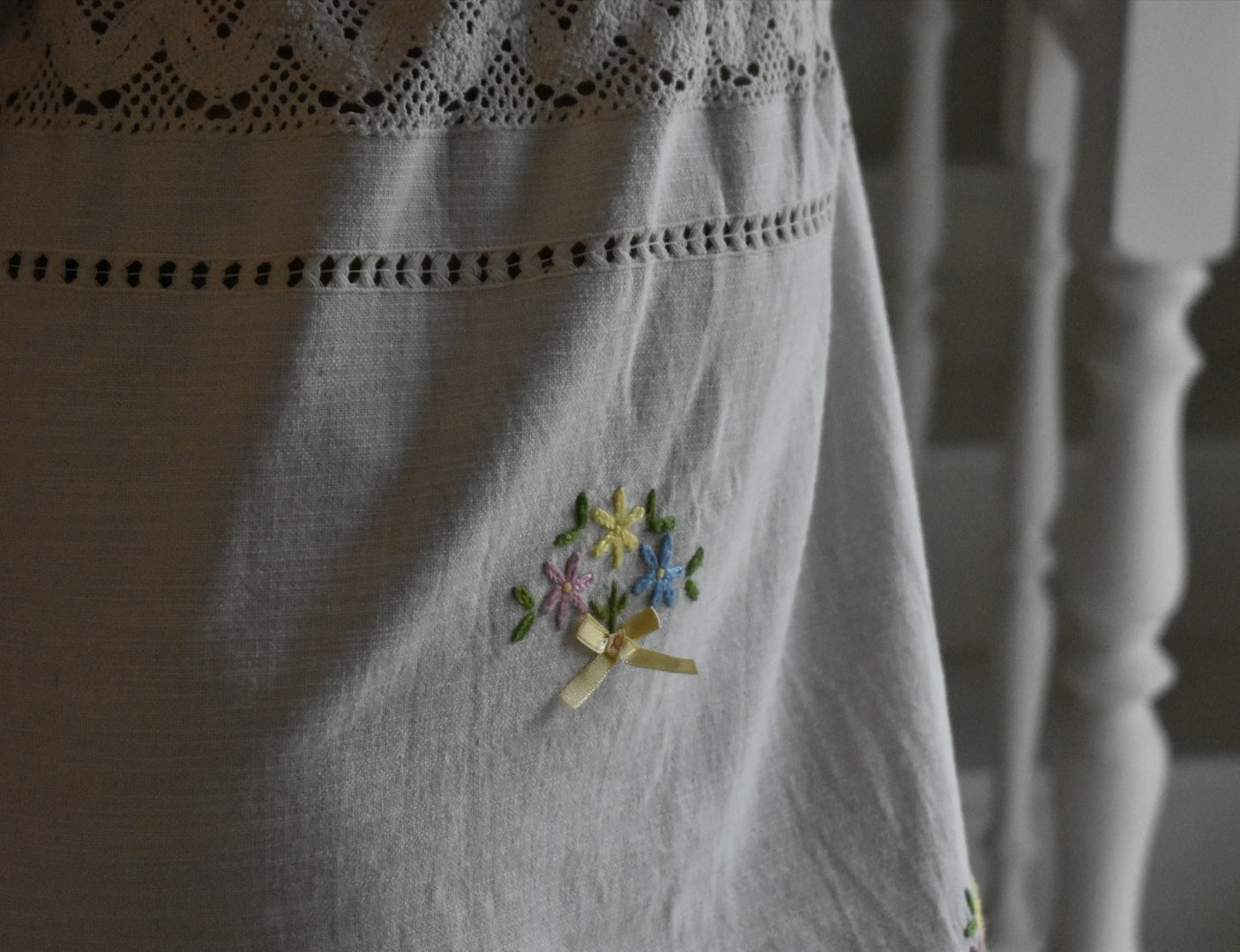 Materiale: tessuti acquistati nei mercati locali. La parte superiore (escluse le maniche) è realizzata in 95% cotone e 5% elastan. Il tessuto principale del vestito proviene da un materiale vintage senza etichetta di composizione, ma al tatto e alla lavorazione risulta simile a un cotone naturale. Arrichito da dettagli in pizzo e ricami floreali.