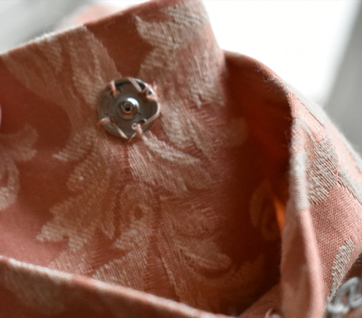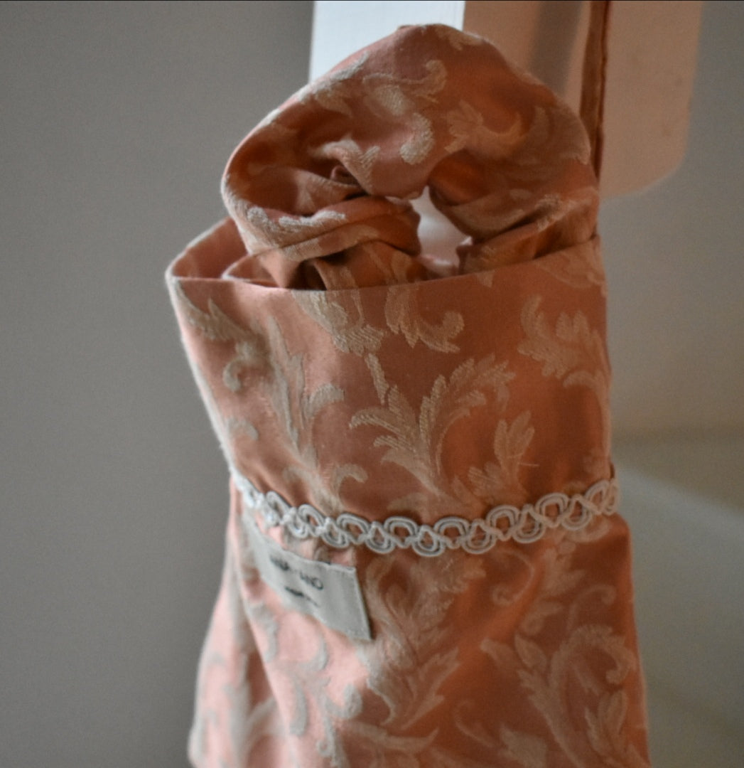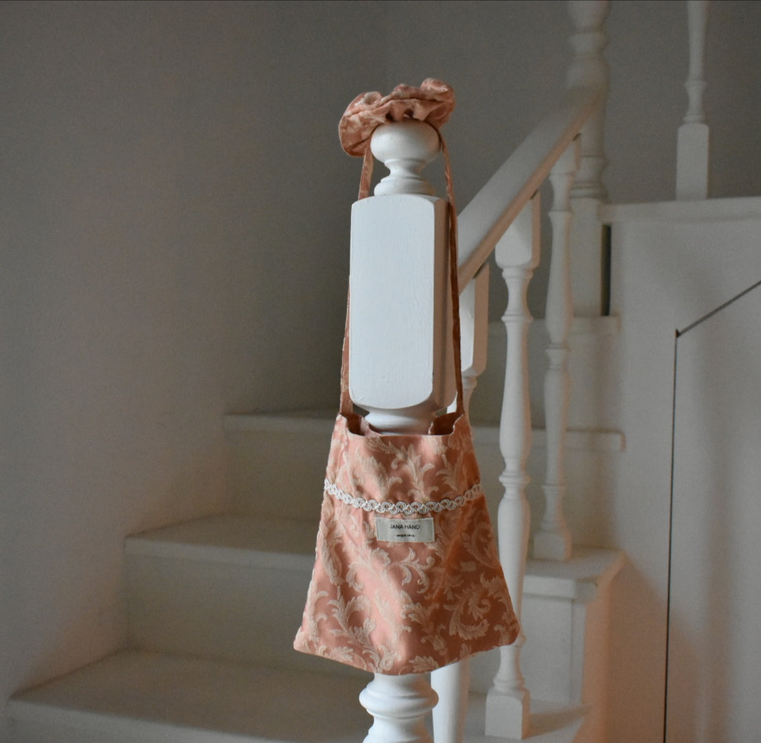 Set borsetta e scrunchie fatti a mano con tessuto antico riutilizzato. Ha un bottone automatico cucito a mano all'interno.